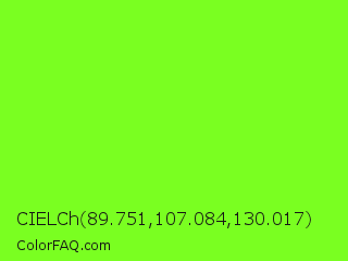 CIELCh 89.751,107.084,130.017 Color is a normal green color and the nearest color is Spring Frost #87ff2a. Hex code #7aff21 and RGB value is rgb(122,255,33). In RGB color space, this color is composed of 48% red, 100% green, 13% blue, In CMYK color space, this color is composed of 52% cyan, 0% magenta, 87% yellow , 0% black , In HSL color space, this color has a hue angle of 96° , 100% saturation and 56% lightness.