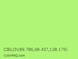 CIELCh 89.786,68.437,128.179 Color is a light green color and the nearest color is Sulu #c1f07c. Hex code #b0f576 and RGB value is rgb(176,245,118). In RGB color space, this color is composed of 69% red, 96% green, 46% blue, In CMYK color space, this color is composed of 28% cyan, 0% magenta, 52% yellow , 4% black , In HSL color space, this color has a hue angle of 93° , 86% saturation and 71% lightness.