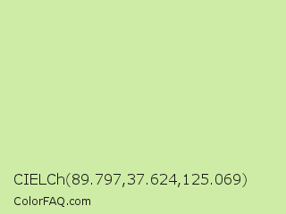 CIELCh 89.797,37.624,125.069 Color is a light green color and the nearest color is Gossip #d2f8b0. Hex code #ceeca6 and RGB value is rgb(206,236,166). In RGB color space, this color is composed of 81% red, 93% green, 65% blue, In CMYK color space, this color is composed of 13% cyan, 0% magenta, 30% yellow , 7% black , In HSL color space, this color has a hue angle of 86° , 65% saturation and 79% lightness.