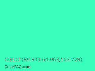 CIELCh 89.849,64.963,163.728 Color is a light green color and the nearest color is Turquoise #40e0d0. Hex code #36ffbd and RGB value is rgb(54,255,189). In RGB color space, this color is composed of 21% red, 100% green, 74% blue, In CMYK color space, this color is composed of 79% cyan, 0% magenta, 26% yellow , 0% black , In HSL color space, this color has a hue angle of 160° , 100% saturation and 61% lightness.