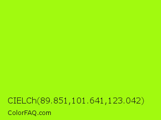 CIELCh 89.851,101.641,123.042 Color is a normal green color and the nearest color is Spring Bud #a7fc00. Hex code #a1fa0f and RGB value is rgb(161,250,15). In RGB color space, this color is composed of 63% red, 98% green, 6% blue, In CMYK color space, this color is composed of 36% cyan, 0% magenta, 94% yellow , 2% black , In HSL color space, this color has a hue angle of 83° , 96% saturation and 52% lightness.