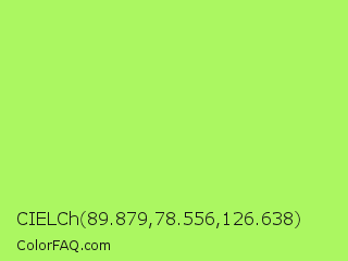 CIELCh 89.879,78.556,126.638 Color is a light green color and the nearest color is Inchworm #b2ec5d. Hex code #abf761 and RGB value is rgb(171,247,97). In RGB color space, this color is composed of 67% red, 97% green, 38% blue, In CMYK color space, this color is composed of 31% cyan, 0% magenta, 61% yellow , 3% black , In HSL color space, this color has a hue angle of 90° , 90% saturation and 67% lightness.