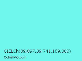 CIELCh 89.897,39.741,189.303 Color is a light cyan color and the nearest color is Electric Blue #7df9ff. Hex code #70f7ed and RGB value is rgb(112,247,237). In RGB color space, this color is composed of 44% red, 97% green, 93% blue, In CMYK color space, this color is composed of 55% cyan, 0% magenta, 4% yellow , 3% black , In HSL color space, this color has a hue angle of 176° , 89% saturation and 70% lightness.