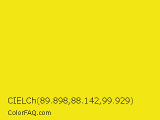 CIELCh 89.898,88.142,99.929 Color is a normal yellow color and the nearest color is Lemon #fde910. Hex code #f2e715 and RGB value is rgb(242,231,21). In RGB color space, this color is composed of 95% red, 91% green, 8% blue, In CMYK color space, this color is composed of 0% cyan, 5% magenta, 91% yellow , 5% black , In HSL color space, this color has a hue angle of 57° , 89% saturation and 52% lightness.