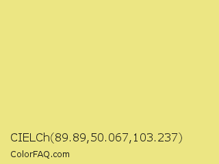 CIELCh 89.89,50.067,103.237 Color is a light yellow color and the nearest color is Sahara Sand #f1e788. Hex code #ece683 and RGB value is rgb(236,230,131). In RGB color space, this color is composed of 93% red, 90% green, 51% blue, In CMYK color space, this color is composed of 0% cyan, 3% magenta, 44% yellow , 7% black , In HSL color space, this color has a hue angle of 57° , 73% saturation and 72% lightness.
