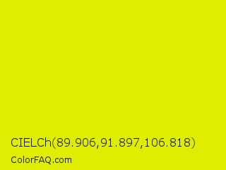 CIELCh 89.906,91.897,106.818 Color is a normal yellow color and the nearest color is Peridot #e6e200. Hex code #deed01 and RGB value is rgb(222,237,1). In RGB color space, this color is composed of 87% red, 93% green, 0% blue, In CMYK color space, this color is composed of 6% cyan, 0% magenta, 100% yellow , 7% black , In HSL color space, this color has a hue angle of 64° , 99% saturation and 47% lightness.
