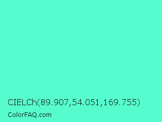 CIELCh 89.907,54.051,169.755 Color is a light green color and the nearest color is Turquoise #40e0d0. Hex code #57fcce and RGB value is rgb(87,252,206). In RGB color space, this color is composed of 34% red, 99% green, 81% blue, In CMYK color space, this color is composed of 65% cyan, 0% magenta, 18% yellow , 1% black , In HSL color space, this color has a hue angle of 163° , 96% saturation and 66% lightness.