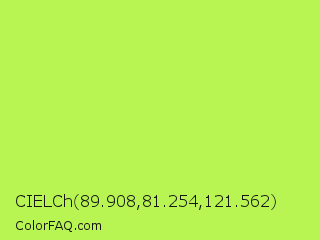 CIELCh 89.908,81.254,121.562 Color is a light green color and the nearest color is Inchworm #b2ec5d. Hex code #b8f552 and RGB value is rgb(184,245,82). In RGB color space, this color is composed of 72% red, 96% green, 32% blue, In CMYK color space, this color is composed of 25% cyan, 0% magenta, 67% yellow , 4% black , In HSL color space, this color has a hue angle of 82° , 89% saturation and 64% lightness.