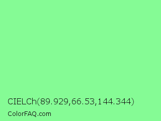CIELCh 89.929,66.53,144.344 Color is a light green color and the nearest color is Light Green #90ee90. Hex code #85fb95 and RGB value is rgb(133,251,149). In RGB color space, this color is composed of 52% red, 98% green, 58% blue, In CMYK color space, this color is composed of 47% cyan, 0% magenta, 41% yellow , 2% black , In HSL color space, this color has a hue angle of 128° , 94% saturation and 75% lightness.