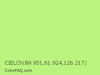 CIELCh 89.951,61.924,126.217 Color is a light green color and the nearest color is Sulu #c1f07c. Hex code #bbf37f and RGB value is rgb(187,243,127). In RGB color space, this color is composed of 73% red, 95% green, 50% blue, In CMYK color space, this color is composed of 23% cyan, 0% magenta, 48% yellow , 5% black , In HSL color space, this color has a hue angle of 89° , 83% saturation and 73% lightness.