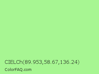 CIELCh 89.953,58.67,136.24 Color is a light green color and the nearest color is Pale Green #98fb98. Hex code #a7f692 and RGB value is rgb(167,246,146). In RGB color space, this color is composed of 65% red, 96% green, 57% blue, In CMYK color space, this color is composed of 32% cyan, 0% magenta, 41% yellow , 4% black , In HSL color space, this color has a hue angle of 107° , 85% saturation and 77% lightness.