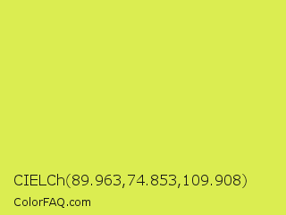 CIELCh 89.963,74.853,109.908 Color is a light yellow color and the nearest color is Maximum Green Yellow #d9e650. Hex code #dbed51 and RGB value is rgb(219,237,81). In RGB color space, this color is composed of 86% red, 93% green, 32% blue, In CMYK color space, this color is composed of 8% cyan, 0% magenta, 66% yellow , 7% black , In HSL color space, this color has a hue angle of 67° , 81% saturation and 62% lightness.