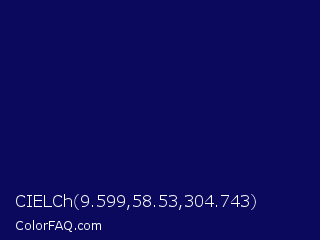 CIELCh 9.599,58.53,304.743 Color is a very dark indigo color and the nearest color is Arapawa #110c6c. Hex code #0b095e and RGB value is rgb(11,9,94). In RGB color space, this color is composed of 4% red, 4% green, 37% blue, In CMYK color space, this color is composed of 88% cyan, 90% magenta, 0% yellow , 63% black , In HSL color space, this color has a hue angle of 241° , 83% saturation and 20% lightness.