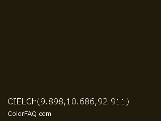 CIELCh 9.898,10.686,92.911 Color is a almost black yellow color and the nearest color is Eternity #211a0e. Hex code #201b0a and RGB value is rgb(32,27,10). In RGB color space, this color is composed of 13% red, 11% green, 4% blue, In CMYK color space, this color is composed of 0% cyan, 16% magenta, 69% yellow , 87% black , In HSL color space, this color has a hue angle of 46° , 52% saturation and 8% lightness.