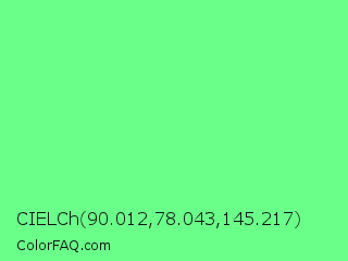 CIELCh 90.012,78.043,145.217 Color is a light green color and the nearest color is Very Light Malachite Green #64e986. Hex code #69ff89 and RGB value is rgb(105,255,137). In RGB color space, this color is composed of 41% red, 100% green, 54% blue, In CMYK color space, this color is composed of 59% cyan, 0% magenta, 46% yellow , 0% black , In HSL color space, this color has a hue angle of 133° , 100% saturation and 71% lightness.