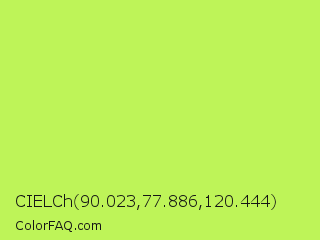 CIELCh 90.023,77.886,120.444 Color is a light green color and the nearest color is Inchworm #b2ec5d. Hex code #bef458 and RGB value is rgb(190,244,88). In RGB color space, this color is composed of 75% red, 96% green, 35% blue, In CMYK color space, this color is composed of 22% cyan, 0% magenta, 64% yellow , 4% black , In HSL color space, this color has a hue angle of 81° , 88% saturation and 65% lightness.