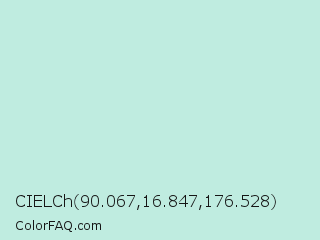 CIELCh 90.067,16.847,176.528 Color is a very light cyan color and the nearest color is Jagged Ice #c2e8e5. Hex code #bfece0 and RGB value is rgb(191,236,224). In RGB color space, this color is composed of 75% red, 93% green, 88% blue, In CMYK color space, this color is composed of 19% cyan, 0% magenta, 5% yellow , 7% black , In HSL color space, this color has a hue angle of 164° , 54% saturation and 84% lightness.