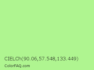 CIELCh 90.06,57.548,133.449 Color is a light green color and the nearest color is Granny Smith Apple #a8e4a0. Hex code #aff590 and RGB value is rgb(175,245,144). In RGB color space, this color is composed of 69% red, 96% green, 56% blue, In CMYK color space, this color is composed of 29% cyan, 0% magenta, 41% yellow , 4% black , In HSL color space, this color has a hue angle of 102° , 83% saturation and 76% lightness.