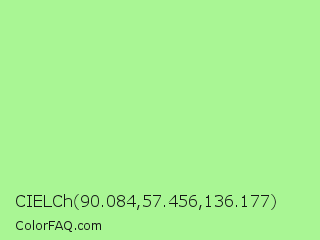 CIELCh 90.084,57.456,136.177 Color is a light green color and the nearest color is Pale Green #98fb98. Hex code #a9f694 and RGB value is rgb(169,246,148). In RGB color space, this color is composed of 66% red, 96% green, 58% blue, In CMYK color space, this color is composed of 31% cyan, 0% magenta, 40% yellow , 4% black , In HSL color space, this color has a hue angle of 107° , 84% saturation and 77% lightness.