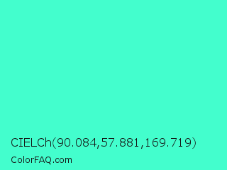 CIELCh 90.084,57.881,169.719 Color is a light cyan color and the nearest color is Turquoise #40e0d0. Hex code #43fecd and RGB value is rgb(67,254,205). In RGB color space, this color is composed of 26% red, 100% green, 80% blue, In CMYK color space, this color is composed of 74% cyan, 0% magenta, 19% yellow , 0% black , In HSL color space, this color has a hue angle of 164° , 99% saturation and 63% lightness.