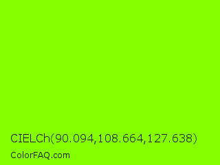 CIELCh 90.094,108.664,127.638 Color is a normal green color and the nearest color is Chartreuse #7fff00. Hex code #85ff00 and RGB value is rgb(133,255,0). In RGB color space, this color is composed of 52% red, 100% green, 0% blue, In CMYK color space, this color is composed of 48% cyan, 0% magenta, 100% yellow , 0% black , In HSL color space, this color has a hue angle of 89° , 100% saturation and 50% lightness.