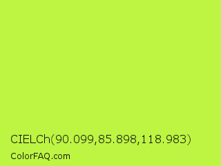 CIELCh 90.099,85.898,118.983 Color is a light lime color and the nearest color is Green Yellow #adff2f. Hex code #bdf542 and RGB value is rgb(189,245,66). In RGB color space, this color is composed of 74% red, 96% green, 26% blue, In CMYK color space, this color is composed of 23% cyan, 0% magenta, 73% yellow , 4% black , In HSL color space, this color has a hue angle of 79° , 90% saturation and 61% lightness.
