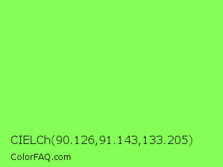 CIELCh 90.126,91.143,133.205 Color is a light green color and the nearest color is Screamin Green #66ff66. Hex code #85fe58 and RGB value is rgb(133,254,88). In RGB color space, this color is composed of 52% red, 100% green, 35% blue, In CMYK color space, this color is composed of 48% cyan, 0% magenta, 65% yellow , 0% black , In HSL color space, this color has a hue angle of 104° , 99% saturation and 67% lightness.