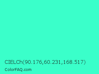 CIELCh 90.176,60.231,168.517 Color is a light cyan color and the nearest color is Turquoise #40e0d0. Hex code #3affca and RGB value is rgb(58,255,202). In RGB color space, this color is composed of 23% red, 100% green, 79% blue, In CMYK color space, this color is composed of 77% cyan, 0% magenta, 21% yellow , 0% black , In HSL color space, this color has a hue angle of 164° , 100% saturation and 61% lightness.