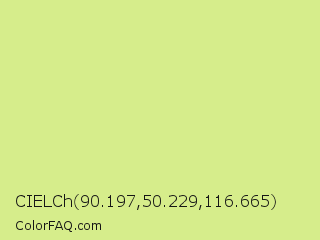 CIELCh 90.197,50.229,116.665 Color is a light lime color and the nearest color is Mindaro #e3f988. Hex code #d6ed8b and RGB value is rgb(214,237,139). In RGB color space, this color is composed of 84% red, 93% green, 55% blue, In CMYK color space, this color is composed of 10% cyan, 0% magenta, 41% yellow , 7% black , In HSL color space, this color has a hue angle of 74° , 73% saturation and 74% lightness.