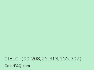 CIELCh 90.208,25.313,155.307 Color is a very light green color and the nearest color is Madang #b7f0be. Hex code #bbefce and RGB value is rgb(187,239,206). In RGB color space, this color is composed of 73% red, 94% green, 81% blue, In CMYK color space, this color is composed of 22% cyan, 0% magenta, 14% yellow , 6% black , In HSL color space, this color has a hue angle of 142° , 62% saturation and 84% lightness.