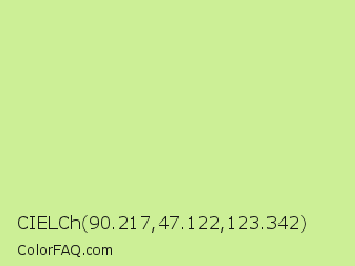 CIELCh 90.217,47.122,123.342 Color is a light green color and the nearest color is Reef #c9ffa2. Hex code #ccef96 and RGB value is rgb(204,239,150). In RGB color space, this color is composed of 80% red, 94% green, 59% blue, In CMYK color space, this color is composed of 15% cyan, 0% magenta, 37% yellow , 6% black , In HSL color space, this color has a hue angle of 84° , 74% saturation and 76% lightness.
