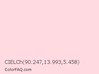 CIELCh 90.247,13.993,5.458 Color is a very light red color and the nearest color is Pig Pink #fdd7e4. Hex code #ffdae1 and RGB value is rgb(255,218,225). In RGB color space, this color is composed of 100% red, 85% green, 88% blue, In CMYK color space, this color is composed of 0% cyan, 15% magenta, 12% yellow , 0% black , In HSL color space, this color has a hue angle of 349° , 100% saturation and 93% lightness.