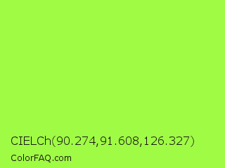 CIELCh 90.274,91.608,126.327 Color is a light green color and the nearest color is French Lime #9efd38. Hex code #a0fb45 and RGB value is rgb(160,251,69). In RGB color space, this color is composed of 63% red, 98% green, 27% blue, In CMYK color space, this color is composed of 36% cyan, 0% magenta, 73% yellow , 2% black , In HSL color space, this color has a hue angle of 90° , 96% saturation and 63% lightness.