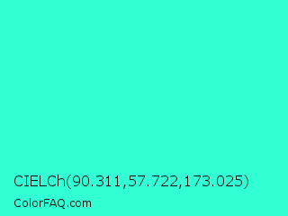 CIELCh 90.311,57.722,173.025 Color is a normal cyan color and the nearest color is Turquoise #40e0d0. Hex code #33ffd4 and RGB value is rgb(51,255,212). In RGB color space, this color is composed of 20% red, 100% green, 83% blue, In CMYK color space, this color is composed of 80% cyan, 0% magenta, 17% yellow , 0% black , In HSL color space, this color has a hue angle of 167° , 100% saturation and 60% lightness.