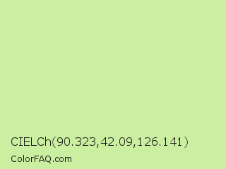 CIELCh 90.323,42.09,126.141 Color is a light green color and the nearest color is Reef #c9ffa2. Hex code #cbefa1 and RGB value is rgb(203,239,161). In RGB color space, this color is composed of 80% red, 94% green, 63% blue, In CMYK color space, this color is composed of 15% cyan, 0% magenta, 33% yellow , 6% black , In HSL color space, this color has a hue angle of 88° , 71% saturation and 78% lightness.