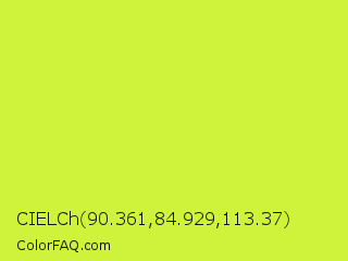 CIELCh 90.361,84.929,113.37 Color is a normal lime color and the nearest color is Pear #d1e231. Hex code #cff23b and RGB value is rgb(207,242,59). In RGB color space, this color is composed of 81% red, 95% green, 23% blue, In CMYK color space, this color is composed of 14% cyan, 0% magenta, 76% yellow , 5% black , In HSL color space, this color has a hue angle of 71° , 88% saturation and 59% lightness.