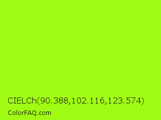 CIELCh 90.388,102.116,123.574 Color is a normal green color and the nearest color is Spring Bud #a7fc00. Hex code #a0fc14 and RGB value is rgb(160,252,20). In RGB color space, this color is composed of 63% red, 99% green, 8% blue, In CMYK color space, this color is composed of 37% cyan, 0% magenta, 92% yellow , 1% black , In HSL color space, this color has a hue angle of 84° , 97% saturation and 53% lightness.