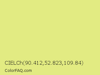 CIELCh 90.412,52.823,109.84 Color is a light yellow color and the nearest color is Key Lime #e8f48c. Hex code #e2eb82 and RGB value is rgb(226,235,130). In RGB color space, this color is composed of 89% red, 92% green, 51% blue, In CMYK color space, this color is composed of 4% cyan, 0% magenta, 45% yellow , 8% black , In HSL color space, this color has a hue angle of 65° , 72% saturation and 72% lightness.