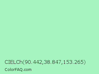 CIELCh 90.442,38.847,153.265 Color is a very light green color and the nearest color is Padua #ade6c4. Hex code #a6f5c1 and RGB value is rgb(166,245,193). In RGB color space, this color is composed of 65% red, 96% green, 76% blue, In CMYK color space, this color is composed of 32% cyan, 0% magenta, 21% yellow , 4% black , In HSL color space, this color has a hue angle of 141° , 80% saturation and 81% lightness.