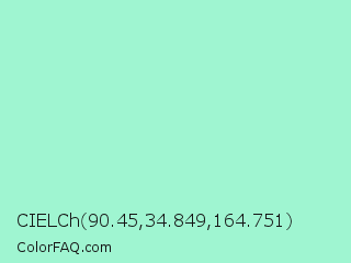CIELCh 90.45,34.849,164.751 Color is a light green color and the nearest color is Magic Mint #aaf0d1. Hex code #9ff5d1 and RGB value is rgb(159,245,209). In RGB color space, this color is composed of 62% red, 96% green, 82% blue, In CMYK color space, this color is composed of 35% cyan, 0% magenta, 15% yellow , 4% black , In HSL color space, this color has a hue angle of 155° , 81% saturation and 79% lightness.