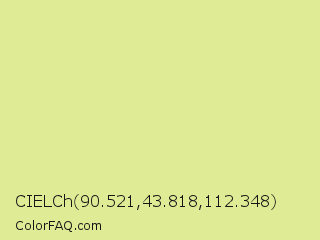 CIELCh 90.521,43.818,112.348 Color is a light yellow color and the nearest color is Primrose #edea99. Hex code #e0eb95 and RGB value is rgb(224,235,149). In RGB color space, this color is composed of 88% red, 92% green, 58% blue, In CMYK color space, this color is composed of 5% cyan, 0% magenta, 37% yellow , 8% black , In HSL color space, this color has a hue angle of 68° , 68% saturation and 75% lightness.