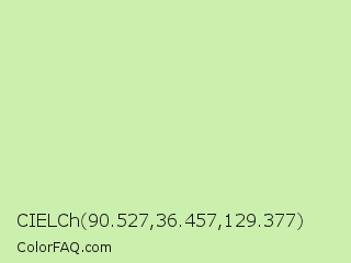 CIELCh 90.527,36.457,129.377 Color is a very light green color and the nearest color is Gossip #d2f8b0. Hex code #cbefad and RGB value is rgb(203,239,173). In RGB color space, this color is composed of 80% red, 94% green, 68% blue, In CMYK color space, this color is composed of 15% cyan, 0% magenta, 28% yellow , 6% black , In HSL color space, this color has a hue angle of 93° , 67% saturation and 81% lightness.