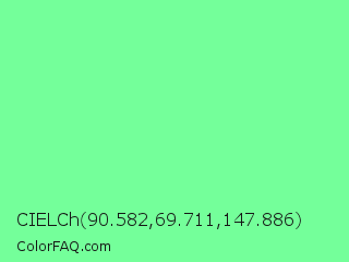 CIELCh 90.582,69.711,147.886 Color is a light green color and the nearest color is Very Light Malachite Green #64e986. Hex code #74ff9a and RGB value is rgb(116,255,154). In RGB color space, this color is composed of 45% red, 100% green, 60% blue, In CMYK color space, this color is composed of 55% cyan, 0% magenta, 40% yellow , 0% black , In HSL color space, this color has a hue angle of 136° , 100% saturation and 73% lightness.