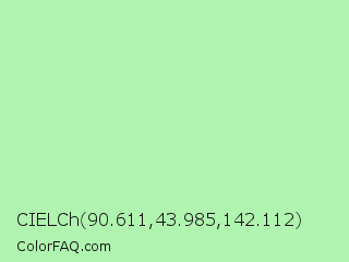 CIELCh 90.611,43.985,142.112 Color is a very light green color and the nearest color is Madang #b7f0be. Hex code #b0f5af and RGB value is rgb(176,245,175). In RGB color space, this color is composed of 69% red, 96% green, 69% blue, In CMYK color space, this color is composed of 28% cyan, 0% magenta, 29% yellow , 4% black , In HSL color space, this color has a hue angle of 119° , 78% saturation and 82% lightness.