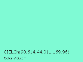 CIELCh 90.614,44.011,169.96 Color is a light green color and the nearest color is Aquamarine #7fffd4. Hex code #7ffad4 and RGB value is rgb(127,250,212). In RGB color space, this color is composed of 50% red, 98% green, 83% blue, In CMYK color space, this color is composed of 49% cyan, 0% magenta, 15% yellow , 2% black , In HSL color space, this color has a hue angle of 161° , 92% saturation and 74% lightness.
