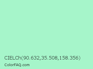 CIELCh 90.632,35.508,158.356 Color is a very light green color and the nearest color is Magic Mint #aaf0d1. Hex code #a6f5ca and RGB value is rgb(166,245,202). In RGB color space, this color is composed of 65% red, 96% green, 79% blue, In CMYK color space, this color is composed of 32% cyan, 0% magenta, 18% yellow , 4% black , In HSL color space, this color has a hue angle of 147° , 80% saturation and 81% lightness.