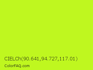 CIELCh 90.641,94.727,117.01 Color is a normal lime color and the nearest color is Arctic Lime #d0ff14. Hex code #bff71f and RGB value is rgb(191,247,31). In RGB color space, this color is composed of 75% red, 97% green, 12% blue, In CMYK color space, this color is composed of 23% cyan, 0% magenta, 87% yellow , 3% black , In HSL color space, this color has a hue angle of 76° , 93% saturation and 55% lightness.