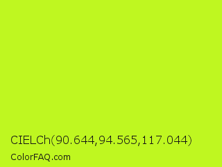 CIELCh 90.644,94.565,117.044 Color is a normal lime color and the nearest color is Arctic Lime #d0ff14. Hex code #bff720 and RGB value is rgb(191,247,32). In RGB color space, this color is composed of 75% red, 97% green, 13% blue, In CMYK color space, this color is composed of 23% cyan, 0% magenta, 87% yellow , 3% black , In HSL color space, this color has a hue angle of 76° , 93% saturation and 55% lightness.