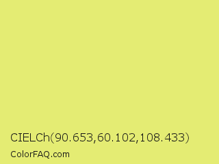 CIELCh 90.653,60.102,108.433 Color is a light yellow color and the nearest color is Manz #eeef78. Hex code #e4ec73 and RGB value is rgb(228,236,115). In RGB color space, this color is composed of 89% red, 93% green, 45% blue, In CMYK color space, this color is composed of 3% cyan, 0% magenta, 51% yellow , 7% black , In HSL color space, this color has a hue angle of 64° , 76% saturation and 69% lightness.
