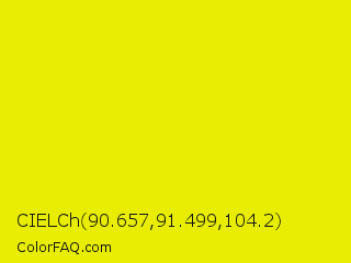 CIELCh 90.657,91.499,104.2 Color is a normal yellow color and the nearest color is Titanium Yellow #eee600. Hex code #e8ed03 and RGB value is rgb(232,237,3). In RGB color space, this color is composed of 91% red, 93% green, 1% blue, In CMYK color space, this color is composed of 2% cyan, 0% magenta, 99% yellow , 7% black , In HSL color space, this color has a hue angle of 61° , 98% saturation and 47% lightness.